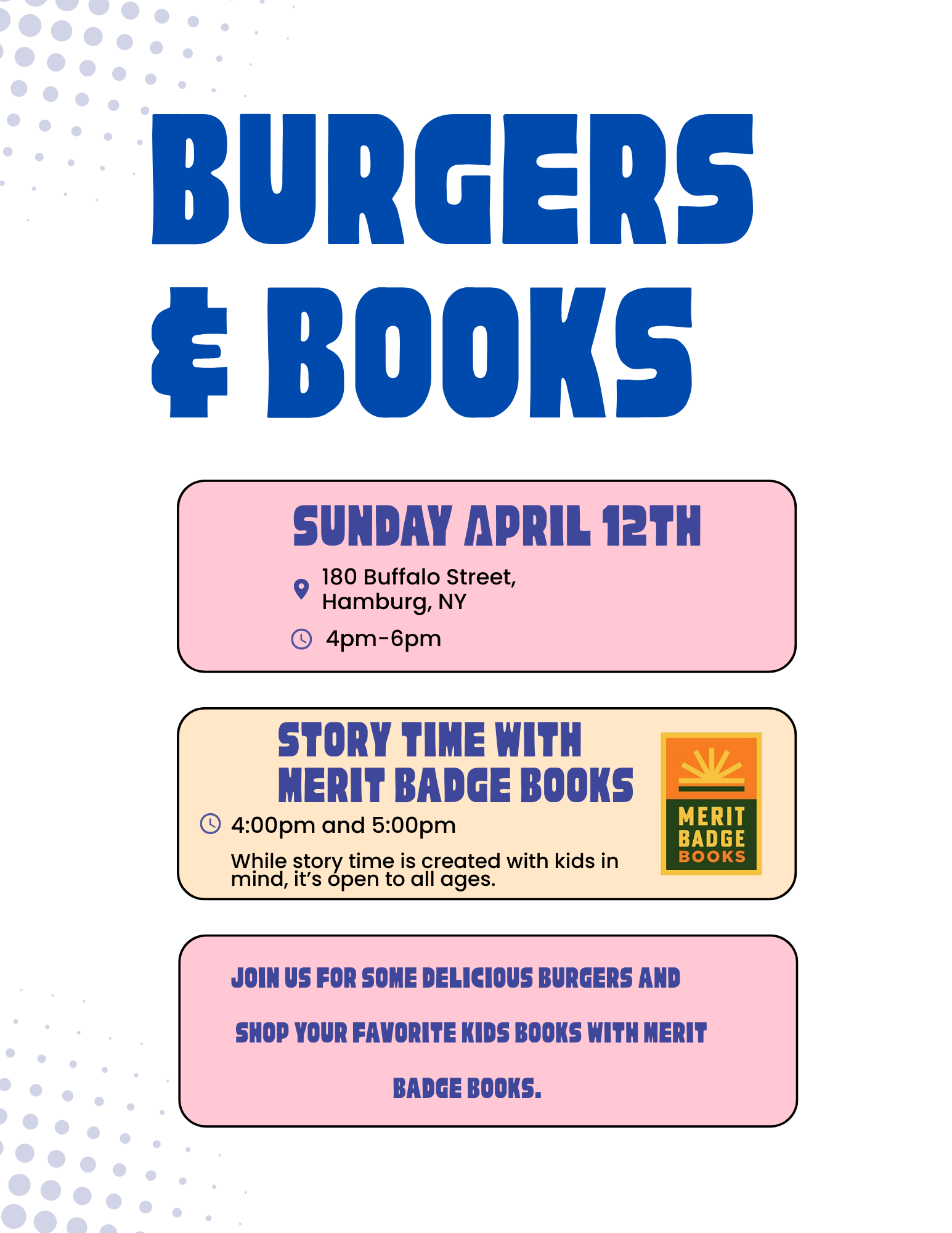 Merit Badge Books is hanging out with our neighbors, Buffalo Bros Burgers, on Sunday April 12th from 4 to 6 PM. Come grab dinner and we’ll keep the kids company with story times at 4 PM and 5 PM. Sip your milkshake, browse children’s books, and let the kids sing silly songs with us while the whole family enjoys tasty burgers and fries!